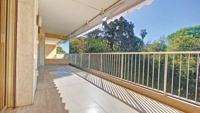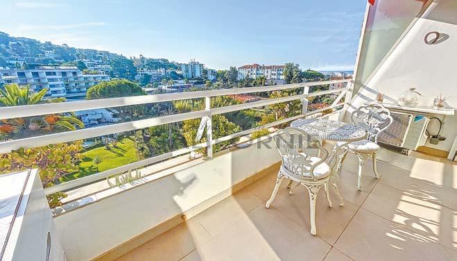 Appartement 3 pièces de 68m² atypique dans domaine fermé datant de l’époque de la reine Victoria. Il bénéficie de 2 terrasses et d’un jardin de 80m² en contre bas et de 2 places de parking et un garage de 17 m² Il offre une très belle vue sur le parc et les îles de Lérins. Accès piéton direct aux commerces. in a private estate dating back to the time of Queen Victoria. It has 2 terraces and 80 m² garden, on a slightly