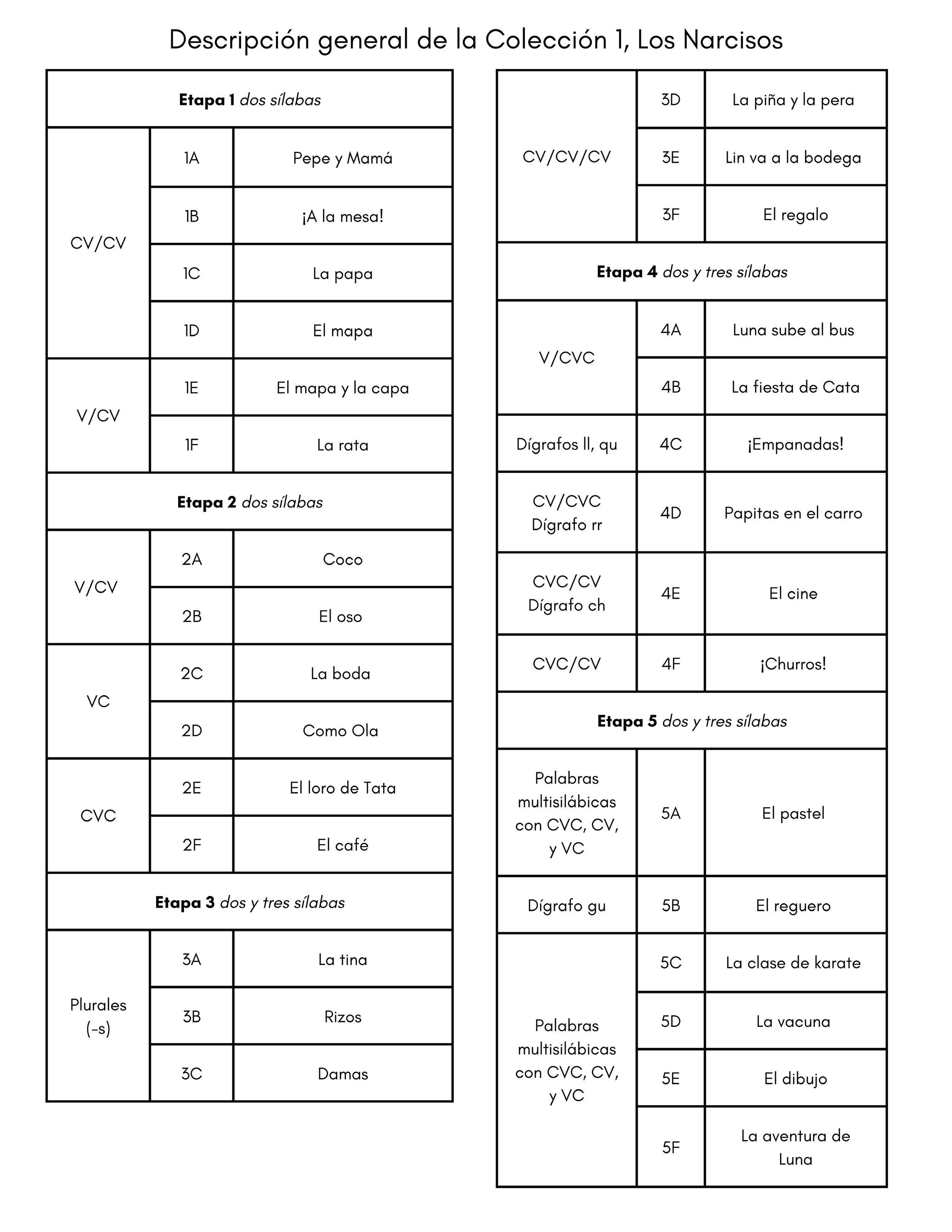Los libros de Daffodil Hill Press son alineados con una variedad de planes de estudio de fonética de Nivel 1 (Tier 1). Cada etapa brinda oportunidades para que los estudiantes practiquen los conceptos fonéticos nuevos que se detallan a continuación. También provee espacio para la revisión de conceptos enseñados previamente. Los libros se enfocan en una instrucción explÍcita y progresiva de tipos de sÍlabas. Las etapas 1 y 2 contienen palabras de dos sÍlabas y en la etapa 3 se introducen las palabras de tres sÍlabas. A través de esta secuencia, los estudiantes aprenden y practican los tipos de sÍlabas en contexto. Luego tienen la oportunidad de combinar tipos de sÍlabas en palabras, por ejemplo: tengo, subir y enfermo. Las vocales se introducen lentamente a lo largo de las etapas con la meta de proveer mucha práctica con coda una. En algunos libros se introducen palabras de alta frecuencia de manera sistemática.