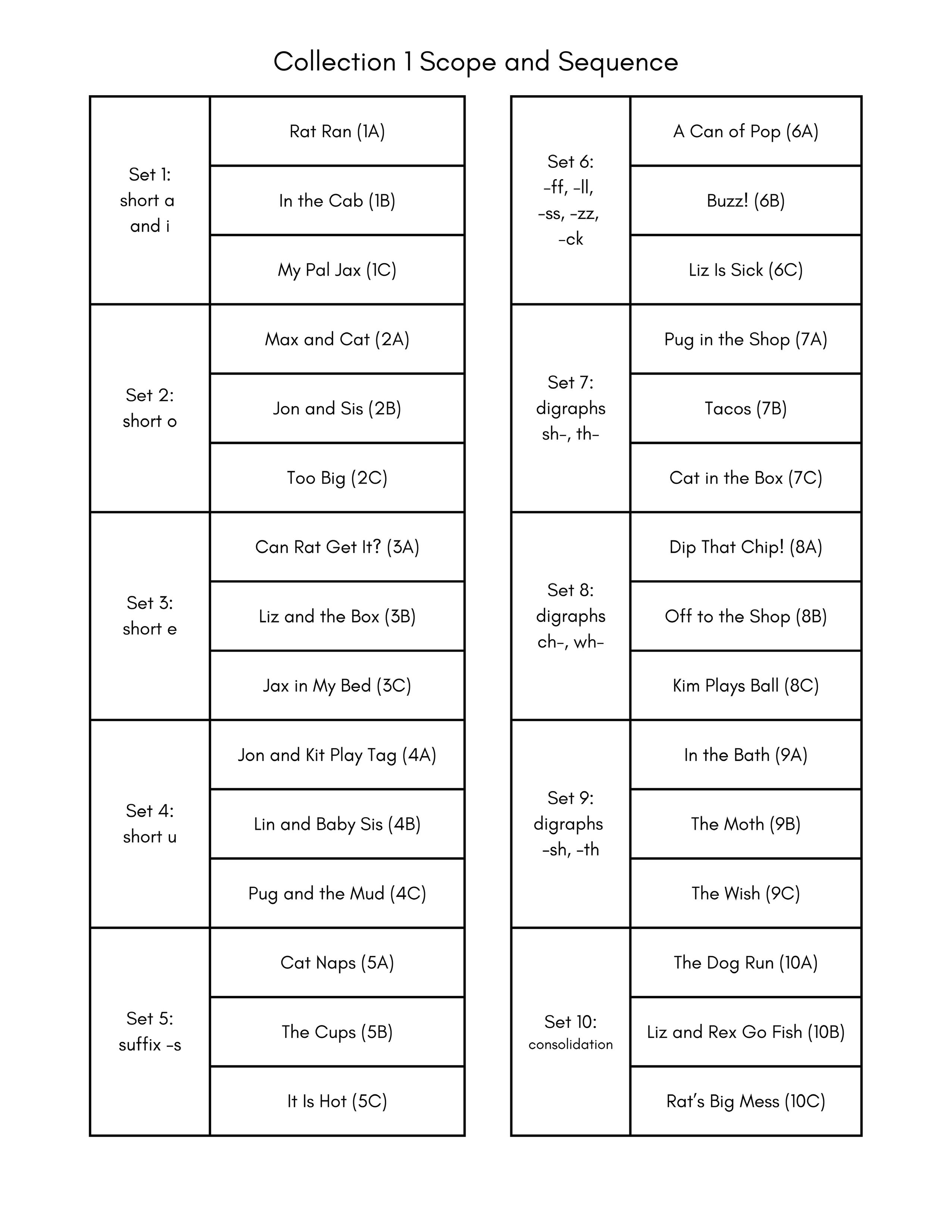 Easily incorporate our decodable readers into any phonics program using our scope & sequence chart, which illustrates the cumulative progression of our books.