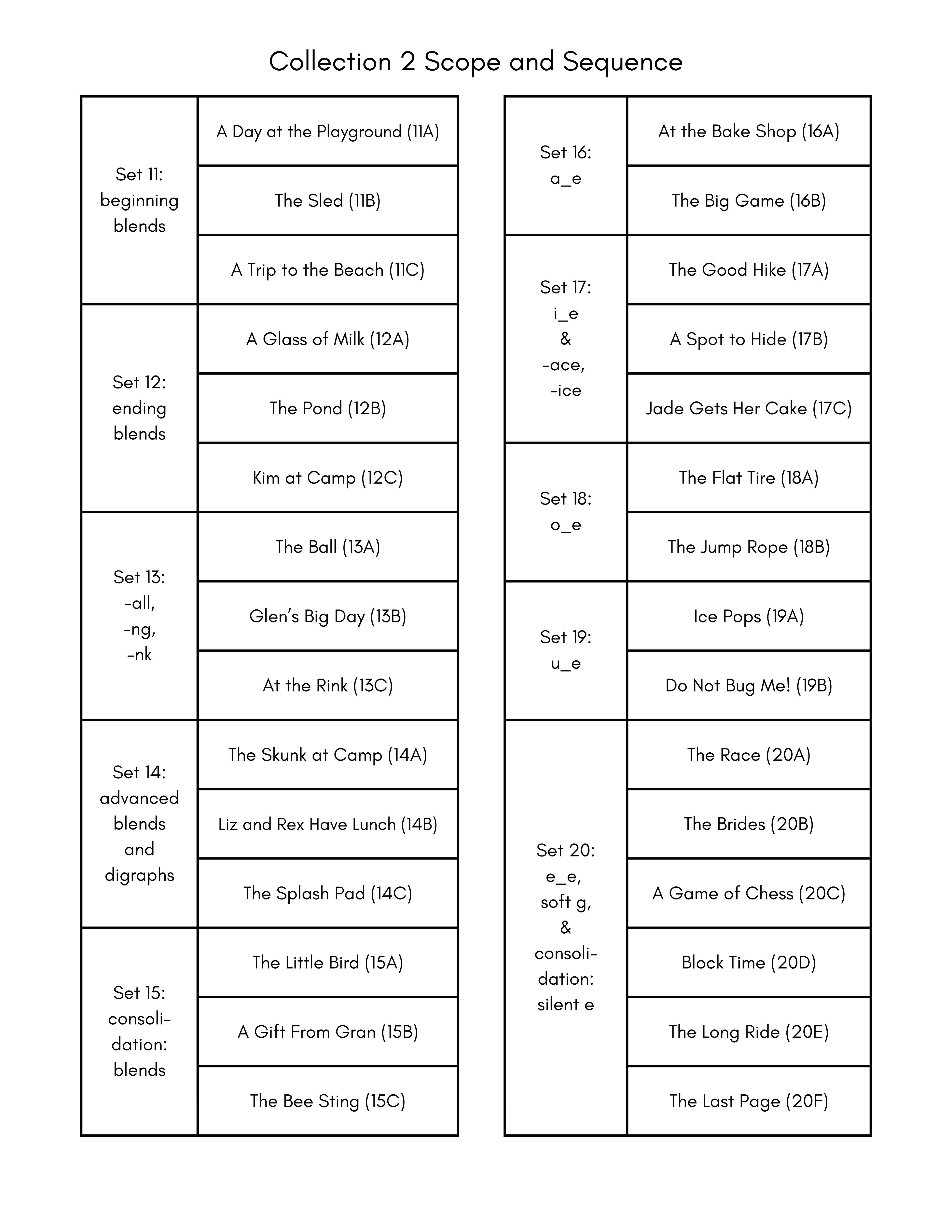 Building on the strong foundation est abli shed in C olle cti on 1 , Collec tion 2 int rodu ces new phonics concept s while reinfor cing pre viou s skills As studen ts master blends and discover the magic of the silent e, they’ll become confiden t reader s read y t o tackle more complex text s.