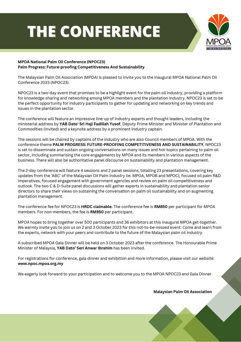 Organised by Malaysian Palm Oil Association Tower 3, Level 8, Unit T3-08-09 & 10, UOA Business Park, No. 1, Jalan Pengaturcara U1/51A Seksyen U1, 40150 Shah Alam, Selangor.