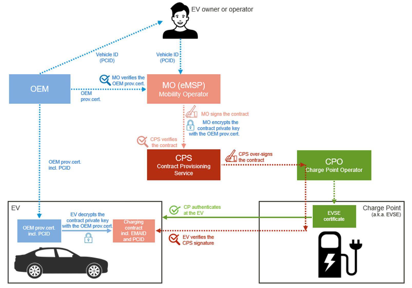 Before an EV can “plug and charge”, the owner or operator of the EV needs to close a contract with an MO. Each PnC contract is bound to one EV of the operator. Contracting includes following steps: