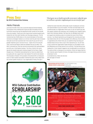 Pres Sez By WSU President Ben Delaney Last week the WSU held a very successful Special General Meeting . The purpose of the meeting was to give the WSU the ability to form a trust which would then go and develop the WSU assets for the benefit of you the student. Thank you to the nearly three hundred students who braved the rain from both Hamilton and Tauranga campuses. The full membership fee of $95 dollars on the recommendation of the board remained unchanged; however our services over the year have increased. Next year as we look to provide even more value for you we will see a greater emphasis put on services for you. Copies of our Annual plan 2010, and Annual Report 2009 are available free at our office. The WSU is all about you, from the services we provide to the representation we do for you in and beyond campus. The irony is that on the same day we the student body were making changes for the future, Roger Douglas was in Parliament advocating that our future be determined by a party with less support than New Zealand First at the last election. The Education (Freedom of Association) Amendment Bill as introduced looks to make student association membership opt-in entry rather than the current system of opt out. In our organizations history, the opt in