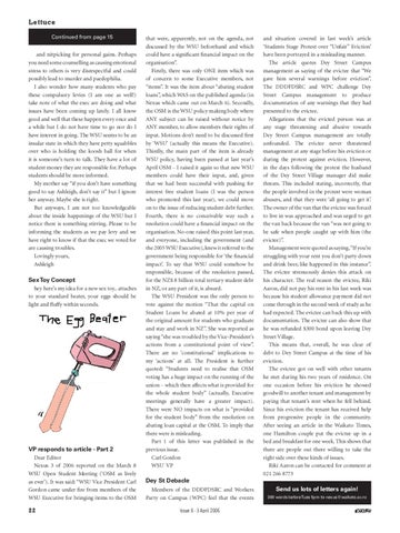 and situation covered in last week’s article ‘Students Stage Protest over “Unfair” Eviction’ have been portrayed in a misleading manner. The article quotes Dey Street Campus management as saying of the evictee that “We gave him several warnings before eviction”. The DDDFDSRC and WPC challenge Dey Street Campus management to produce documentation of any warnings that they had presented to the evictee. Allegations that the evicted person was at any stage threatening and abusive towards Dey Street Campus management are totally unfounded. The evictee never threatened management at any stage before his eviction or during the protest against eviction. However, in the days following the protest the husband of the Dey Street Village manager did make threats. This included stating, incorrectly, that the people involved in the protest were woman abusers, and that they were ‘all going to get it’. The owner of the van that the evictee was forced to live in was approached and was urged to get the van back because the van “was not going to be safe when people caught up with him (the evictee)”. Management were quoted as saying, “If you’re struggling with your rent you don’t party down and drink beer, like happened in this instance”. The evictee strenuously denies this attack on his character. The real reason the evictee, Riki Aaron, did not pay his rent in his last week was because his student allowance payment did not come through in the second week of study as he had expected. The evictee can back this up with documentation. The evictee can also show that he was refunded $300 bond upon leaving Dey Street Village. This means that, overall, he was clear of debt to Dey Street Campus at the time of his eviction. The evictee got on well with other tenants he met during his two years of residence. On one occasion before his eviction he showed goodwill to another tenant and management by paying that tenant’s rent when he fell behind. Since his eviction the tenant has received help from progressive people in the community. After seeing an article in the Waikato Times, one Hamilton couple put the evictee up in a bed and breakfast for one week. This shows that there are people out there willing to take the right side over these kinds of issues. Riki Aaron can be contacted for comment at 021 266 8773