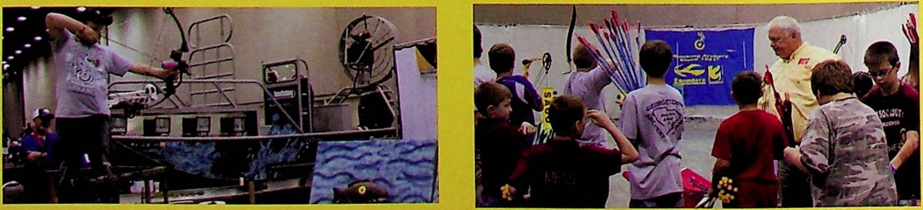 A dedicated location clubbed the "preview area" has recently been completedjust inside the main front entrance of Bass Pro Shops in Springfield, Missouri, the permanent home of the Archery Hall of Fame&: Museum. This "preview area" has the beautiful mural which is shown in the photo. The large (approximately 8 ft. x 12 ft.) original canvas painting by Adam Wolken, depicts lshi, Dr. Sa,\'.ton Pope, Art Young, Howard Hill, and Fred Bear wirh a lme of familiar 4-color targets in the background. This eye-catching mural further represents the Hall by having Olympic medals adorning the corners of the title banner which reads"Heroes and Legends."