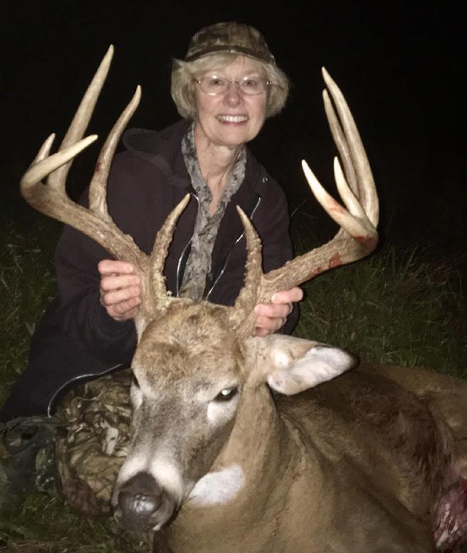 In the early days of our marriage, my wife Jeanne and I would get up before sunrise and hunt a variety of wild game. Then the children came along and she took a break from being my partner in the woods. As her retirement neared, she again picked up the shotgun and also learned to use a crossbow. I had hopes of teaching her how to field dress and drag my deer out of the timber, but that part was unsuccessful. One evening we were hunting from a buddy stand overlooking a path where hours before a large buck had been chasing a doe. Eventually a doe emerged with an eightpointer following close behind. When the buck moved into an opening at 20 yards, I gave a mouth bleat to stop it. At that instant the arrow from Jeanne’s crossbow passed through his lungs in the perfect spot.