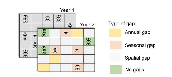 Using this framework, we were able to establish some general principles for when data gaps lead to biased predictions of species’ changes. We show that data gaps are problematic when the causes of gaps are linked with the factors that affect species trends. For example, if there is less sampling where species are faring poorly, then we could paint an overly optimistic picture of change if we analyze the available data without any adjustment for the gaps.