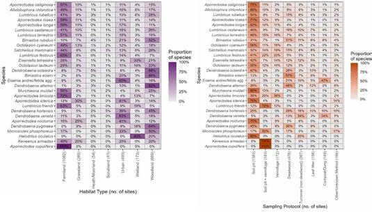 Fig. 3. (left) Proportion of each earthworm species per habitat type in the NERS database. Species ordered from most (top) to least (bottom) commonly occurring. Fig. 4. (right) Proportion of each earthworm species per sampling protocol in the NERS database. Species ordered from most (top) to least (bottom) commonly occurring.