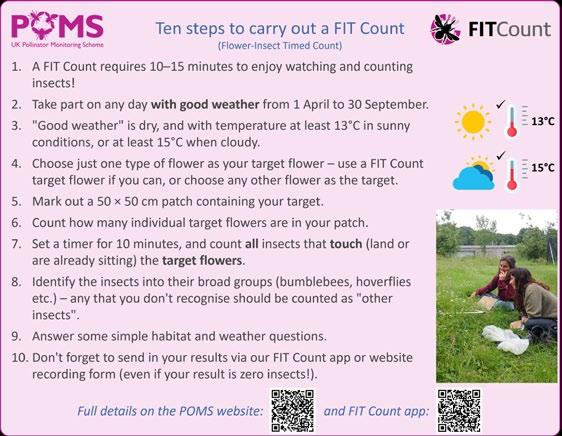 The Flower-Insect Timed Counts (FIT Counts) can be done at any location that has flowers, on any date between 1 April and 30 September (as long as the weather is good). See the summary ‘ten steps’ graphic for more information, or go straight to the FIT Count page on the PoMS website [ https://ukpoms.org.uk/ fit-counts ]. You can also see a webinar “Ten minutes to count the insects!” on how to carry out FIT Counts, with tips on identifying the insect groups that you might see, is available on YouTube [ https://ukpoms.org.uk/node/75 ] (this took place as part of the Citizen Science Showcase in February 2025).