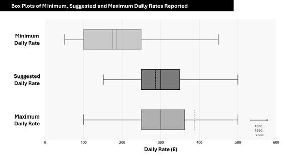y Day Rate Statistics: The mean minimum day rate reported for delivering training was £185, with a median of £175. However, the range was wide, with some respondents citing rates as low as £75 per day, while others reported receiving over £400.