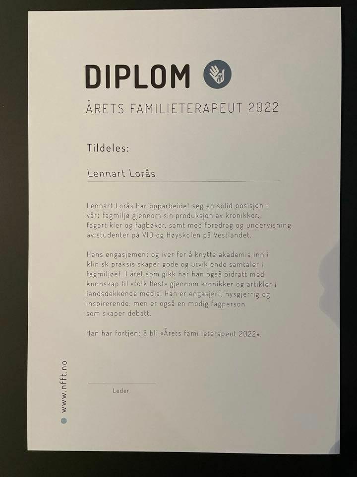 Fagkonferansen med Jacob B Priest og Inga-Britt Krause samt mange spennende workshops ga et godt innblikk i bredde, engasjement ogdilemmaer som karakteriserer fagfeltet for familieterapeuter og systemiske yrkesutøvere Professor Lennart Lorås fikk prisen som Årets Familieterapeut i NFFT, og styret gratulerer! Det ble også gjennomført foreningens generalforsamling 2023, hvor en sertifiseringsordning for utøvere av systemisk