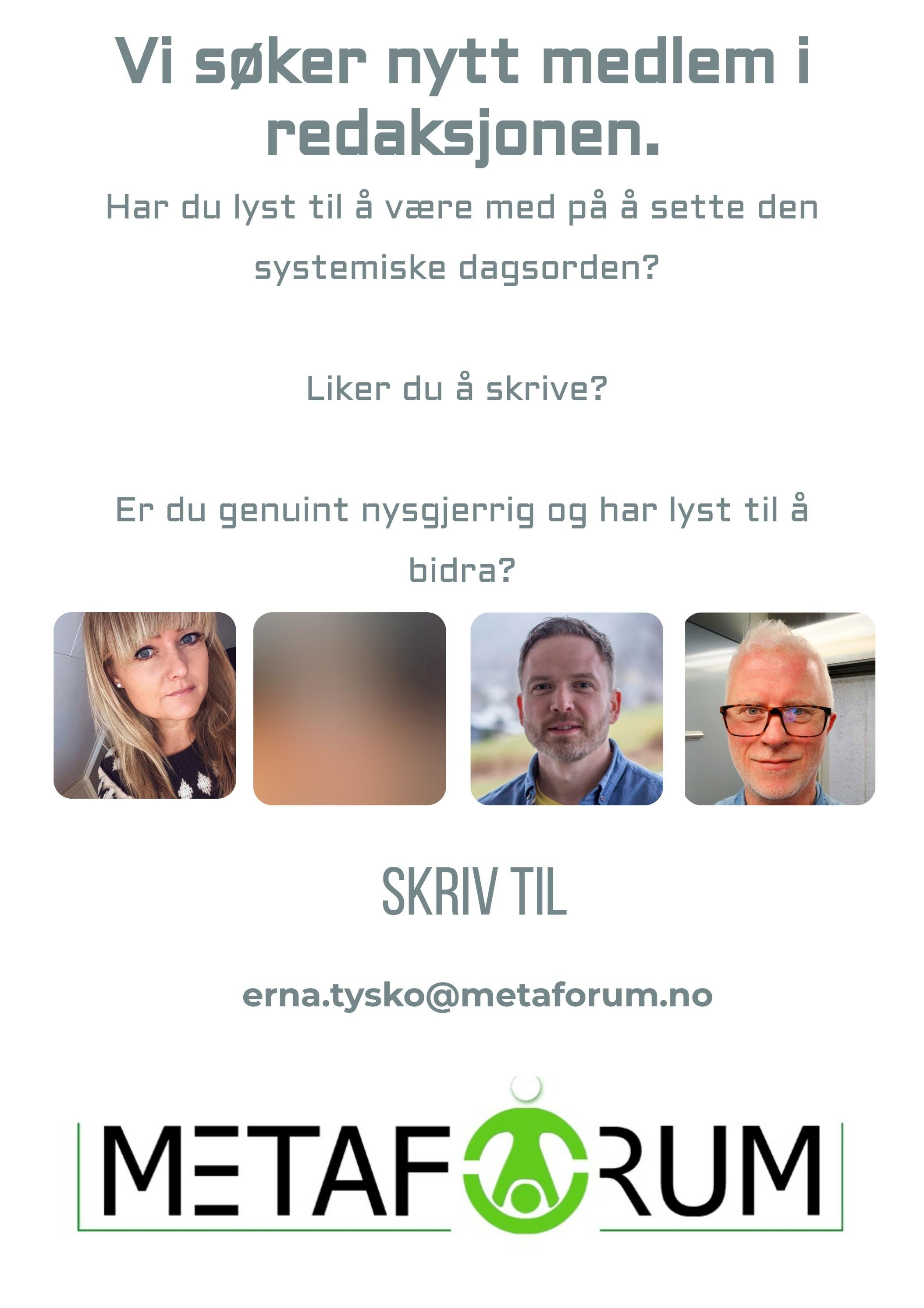 Jeghåper at jegsommedlemi styret kanbidratil å fremme familieterapifeltet og systemisk tenkning som relevant i en omskiftelig verden som utvikler segiet høyt tempo.