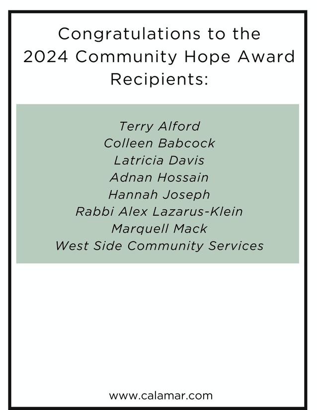 2024 COMMUNITY HOPE AWARDS R A B B I A L E X R A B B I A L E X L A Z A R U S - K L E I N L A Z A R U S - K L E I N H A N N A H H A N N A H J O S E P H J O S E P H A D N A N A D N A N H O S S A I N H O S S A I N M A R Q U E L L M A R Q U E L L M A C K M A C K MARCH 18, 2024 L A T R I C I A L A T R I C I A D A V I S D A V I S T E R R Y A L F O R D T E R R Y A L F O R D C O L L E E N C O L L E E N B A B C O C K B A B C O C K