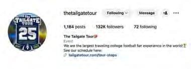 25YearsandStillGoingStrong TheTailgateTouristhelargestandlongestrunningfan experienceincollegesports providingitspartnersa360°turn-keyapproachtoreaching consumersoutofhome. 2025willmark26yearsontheroad!