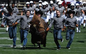Before each game in Boulder, the Buffaloes’ 2,000-pound, live buffalo mascot, Ralphie, takes a big lap around the field, leading the entire Colorado team into the stadium while sporting a CU-themed banner. Though Ralphie is a female bison, which means she has smaller legs and is apparently “less aggressive,” she’s still known to knock her handlers to the ground and run up to 25 mph before kickoff.