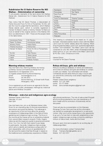 There will also be a presentation on the Wairewa Rūnanga Te Kaio Farm and how all this information can benefit its sustainable development in a real world context. After lunch at the marae there is the opportunity to go up to Te Kaio farm to help with establishing a new organic indigenous agro-ecology orchard by planting a mixture of native trees, herbs and fruit trees. Bring an open mind and a spade for an exciting day of mātauranga Māori. For more information contact Tremane Barr: Email: Tremane.Barr@ngaitahu.iwi.nz Mobile: 027 242 9787. 41