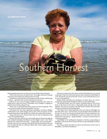 The last recreational one-day take was held at Öreti Beach in 1993. It had a bag limit of just five toheroa per person and a minimum shell length of 10cm. During the nine-hour low tide “season”, it was estimated that 15,000 to 20,000 were gathered. Mateka Pirini remembers the abundance of earlier times. As a sevenyear-old, she enjoyed school holidays with her cousins at Rowallan. “The Boulter family were the experts at getting toheroa. We’d all go down to the beach at low tide as a big family group and dig in the sand together. The secret is to look for two little holes created in the sand when the toheroa withdraw their feeding filters. “The toheroa were much larger then. Even now they’re still bigger out that side of the coast – and we’d only ever get enough to feed ourselves for the day. It’s one of my favourite seafoods and we loved eating them raw, straight out of the sea. All shellfish are precious to Mäori, of course, but toheroa have top priority – along with päua – as long as you know how to cook them properly.” And Mateka is the undisputed champion of toheroa soup-making at Murihiku. Ask anyone there who has the best recipe and Mateka is always mentioned. “She always makes the toheroa soup for any functions we have here at Murihiku,” says Dawne Watkinson. te Karaka KAHURU 2008