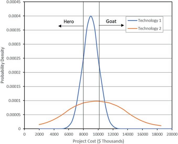 The project manager also has available an alternate process, technology 2, with a higher a priori expected value of $10,000K and a much higher standard deviation of $4,000K. Technology 2 is not only expected to cost more than technology 1, it is far riskier. Using the Normal assumption, the project manager calculates the chances of overrunning the maximum budget with method 2 to be 50%. On the other hand, the chances of being a hero with this technology are 31%. Assume that the project manager has to make a decision on the technology before the design starts; he/she does not have enough time in the schedule to perform one design and then do the other if the first one does not come out satisfactorily. Probably under these conditions the project manager chooses technology 1; the chances of winning