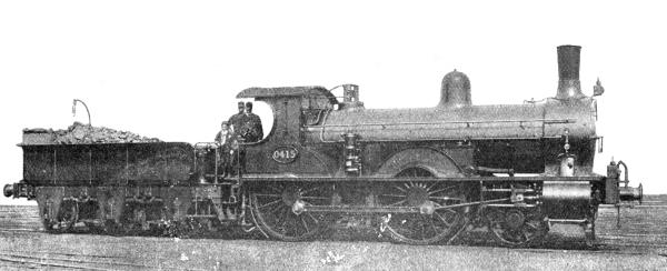 The boiler contained 121 tubes, 10ft. 11in. long, and 1⅞in diameter; steam pressure, 140lb.; water capacity of tank, 950 gallons. The fire-grate was 5ft. long, and sloped from the door to the tube-plate. The springs of the coupled wheels were connected by means of a compensation lever The dome was placed on the raised fire-box, and fitted with a screw-down safety valve; a second valve of the same pattern was fixed on the boiler barrel. A roomy and well-enclosed cab, fitted with side windows, thoroughlyprotectedtheenginemen.