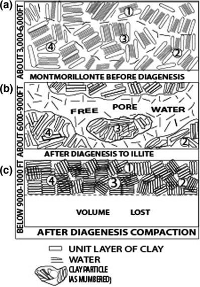 Fig.1.4 Differentstagesofcompactioneffectonclay diagenesis. a Claysconsistofboundwateratthetimeof deposition. b Freewaterincreaseswithburialwiththe consequentreleaseofboundwater. c Freewateris squeezedoutandtheoriginalvolumereduces(Fig.57 inRiekeandChilingarian 1974)