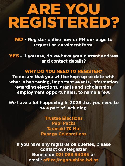 2023 is upon us e te iwi! You’ll be seeing lots of comms coming your way regarding registering and Trustee Elections. Please make sure that all of your whānau are registered and that your details are current. They can register online, or if already registered, update details at www.ngaruahine.iwi.nz or ring/email the Registrar Bonnie Johnstone direct: M: 021 0836 4086 E: Registrar@ngaruahine.iwi.nz
