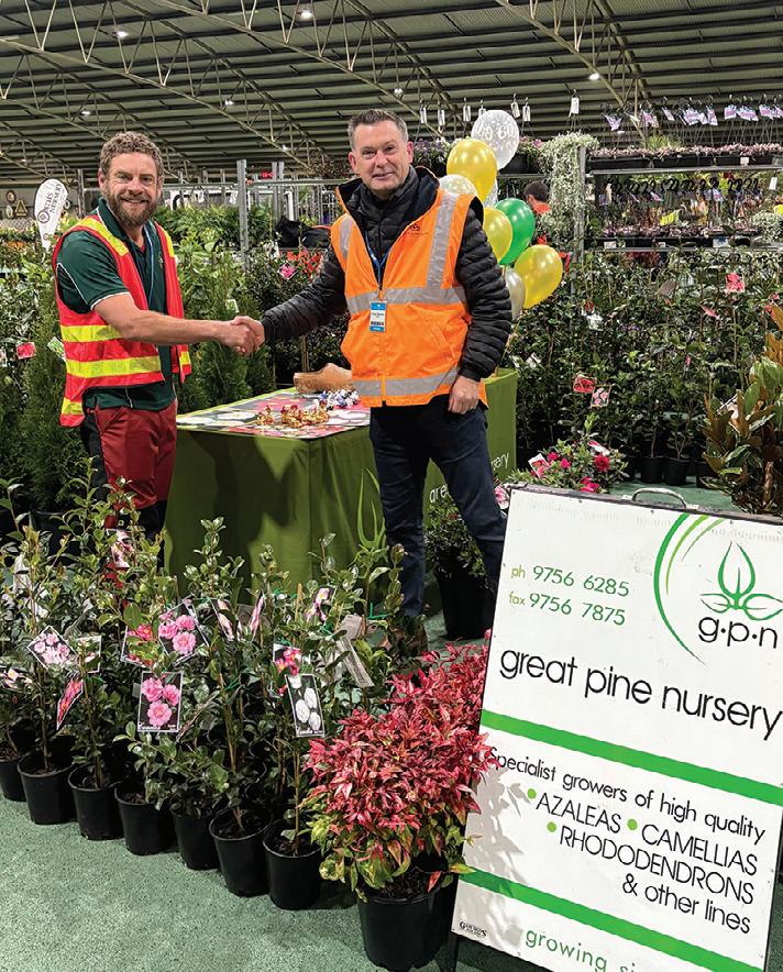 « A warm welcome back to Trade Day for Great Pine Nursery from Monbulk. NGIV CEO Craig Taberner greeted Ryan O’Connor just as trade time was about to begin. Specialist growers of azalea, camellia and rhododendron varieties, GPN are celebrating their 60th year in production – tracing their beginnings back to 1965.