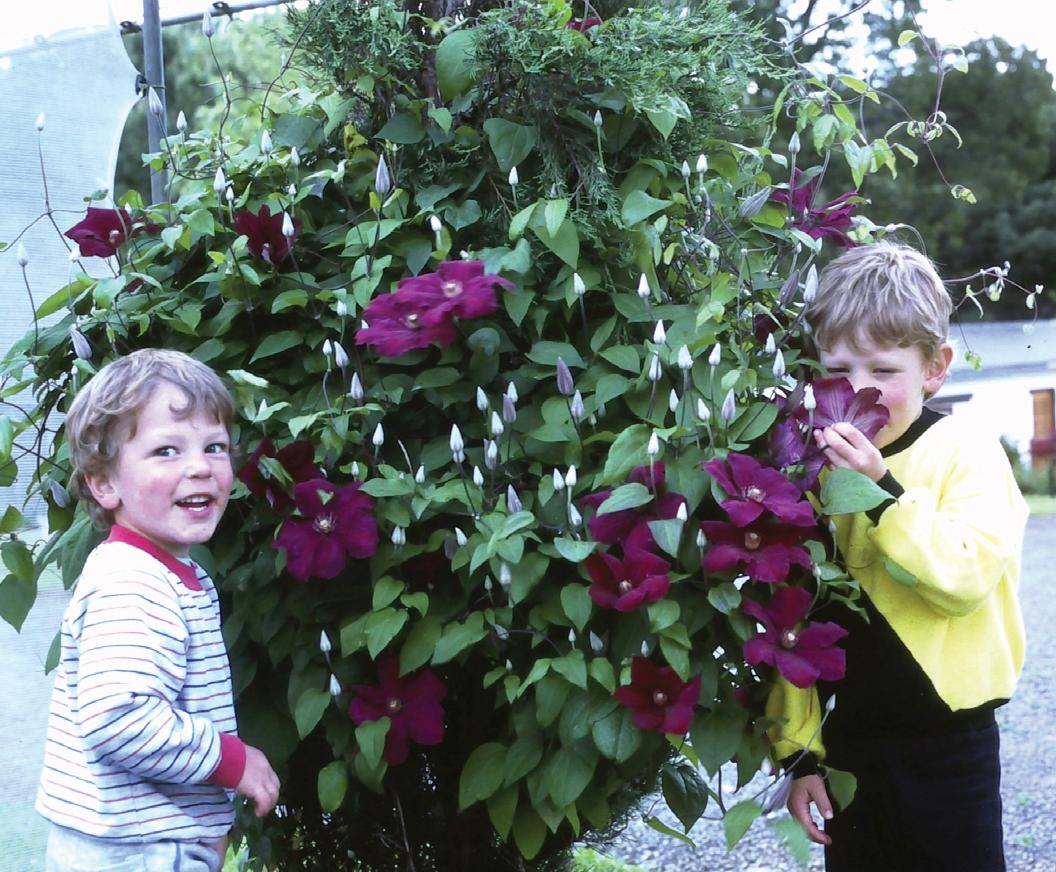Paul (left) and his brother Chris beside the clematis, still standing today.