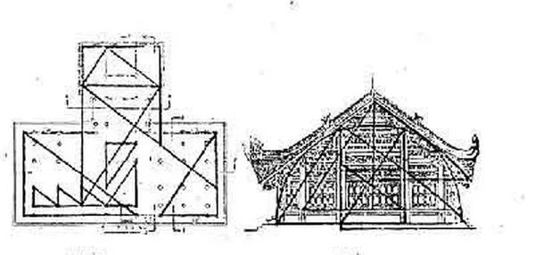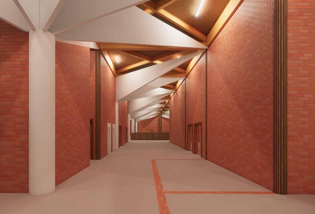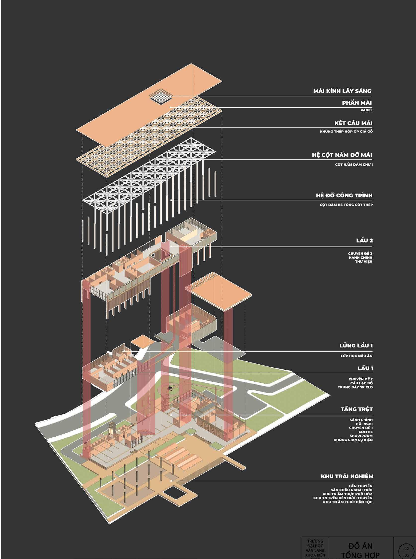 Không gian được chia thành hai nửa. Khu vực trên sử dụng thép phồng và các mẫu hình tam giác để gợi nhớ cấu trúc mái, trong khi không gian phía dưới được mở rộng với tỷ lệ 1/3, dựa trên kiến trúc truyền thống của nhà ba gian.