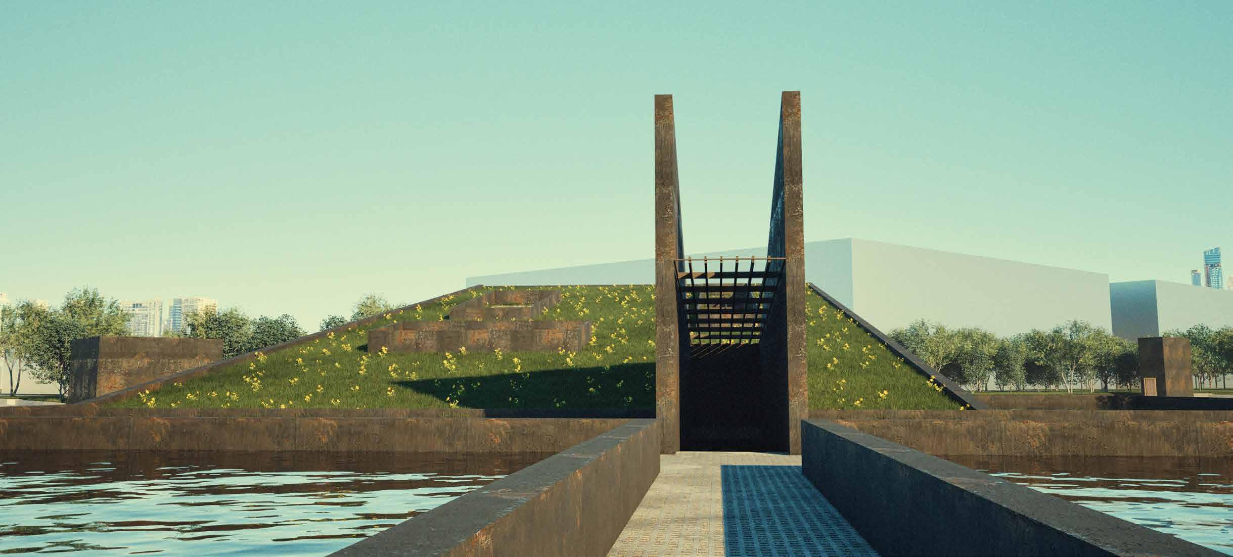 Lối vào được thiết kế để mô phỏng một đoàn tàu nổi lên từ mặt nước, tạo ra trải nghiệm cho du khách, nơi họ lần đầu tiên tách biệt khỏi thế giới ồn ào bên ngoài và được chào đón vào những giá trị lịch sử được trưng bày trong bảo tàng. Hơn nữa, du khách trong công viên có thể sử dụng hình dáng này như một điểm nghỉ ngơi và quan sát đồi.