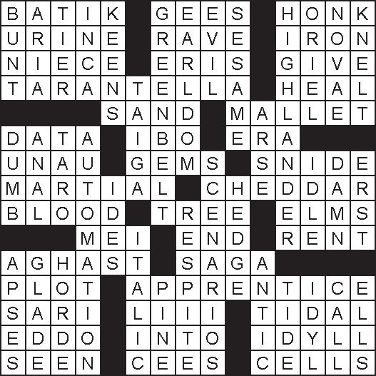 ACROSS 1. Young cow 5. Algonquian Indian 9. Not true 14. Pearly-shelled mussel 15. Animal companions 16. African virus 17. The light of the stars 19. More or less 20. Twilled fabric 21. Heavier-than-air craft 23. Greatcoats 25. In lieu 28. Chap 29. Australian bird 32. Spay 33. Cool, once 34. "What a shame!" 35. British title 36. Yours (archaic) 38. Anagram of "Tine" 39. Press 40. Jump 41. A literate person 43. Donkey 44. French for "Friend" 45. Remedy 46. Convulsive 48. Narrowed one's eyes 50. Rub 54. Edge tool 55. The same 57. Of a pelvic bone 58. 3 times 3 59. Leveling wedge 60. French for "Our" 61. A certain trade agreement 62. Anagram of "Nets" DOWN 1. Swear 2. Blind (poker) 3. Teller of untruths 4. Overlooked 5. Consumer Price Index 6. Consideration 7. Set of principles 8. Female sex hormone 9. Loyalty 10. Religious fathers 11. Diving bird 12. Swing around 13. Consume 18. Embankment 22. Made poor 24. Terran 25. Large Asian country 26. Approaches 27. Japanese wrestlers 29. Leave out 30. Married partners 31. Utilizers 33. Pelvis 34. Radical 37. Hauling up 42. Decree 44. Per 45. Rat or mouse 46. Sweetener 47. TV, radio, etc. 48. Alone 49. Resign 51. Throb 52. Gladly (archaic) 53. Shade trees 54. Martini ingredient 56. Mesh