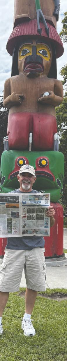 4. Helen Pethick and Denis Paquin took the North Grenville Times to Vancouver Island. Shown is Denis in front of the Knowledge Totem pole at the BC Legislative Buildings in Victoria.