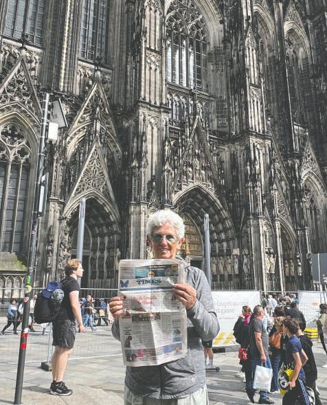 1. Carol Snook sent us a picture of herself with a copy of the paper standing in front of the Cologne (Köln) cathedral in Germany. Construction was begun in 1248, completed in 1880 and it is the tallest twin-spired church in the world.