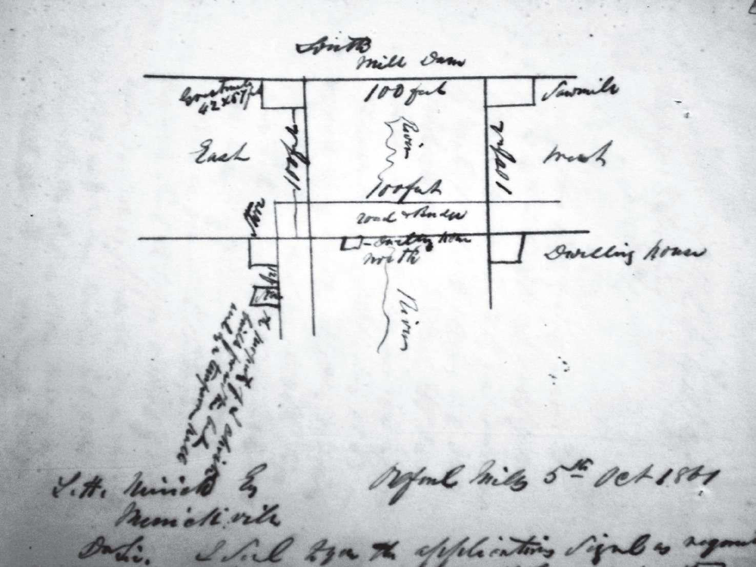 The very first bridge on that spot was a simple plank affair, allowing people to cross between the grist and saw mills which had been built on either bank. Asa Clothier built the first mill and dam here in 1845, leading to the development of Oxford Mills. Rickey Waugh bought the land in 1850, completing the dam as well as a grist mill and saw mill, and the rough plank bridge was erected at that time. Waugh also built the