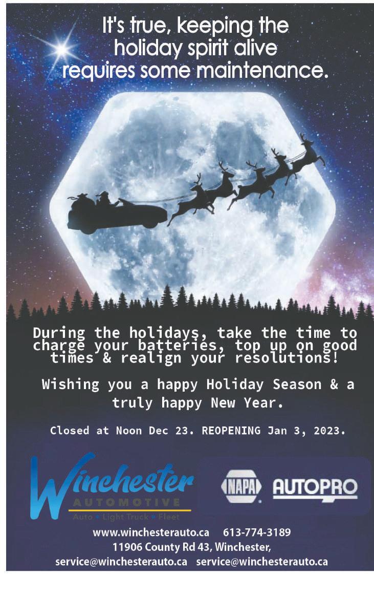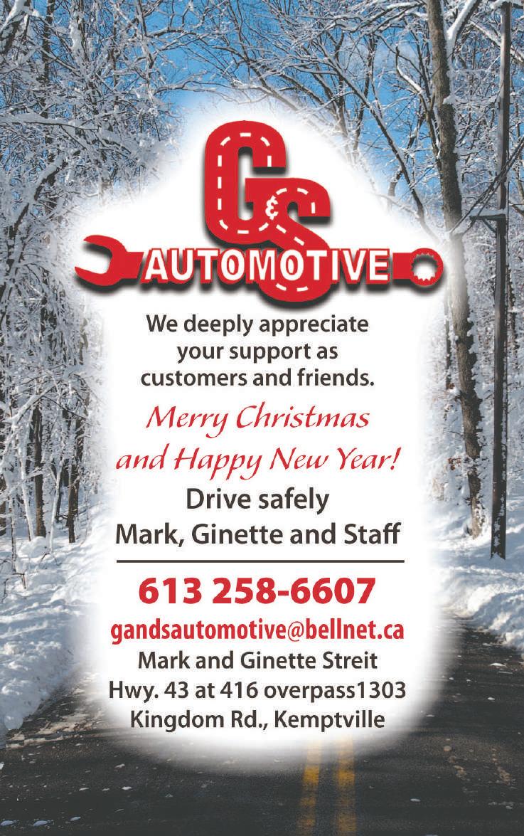 The Voice of North Grenville 22 www.ngtimes.ca The North Grenville Times December 22, 2022 e Law O ce of Connie Lamble 222 Prescott Street, Kemptville www.lamble.ca connie@lamble.613. 258.0038 Wishing you all a very Merry Christmas We are fully authorized to perform warranty-approved maintenance on new vehicle 613-283-7444 Open Monday to Friday 8 am to 5:30 pm 714 Kilmarnock Road, Jasper www.ogilviesauto.com Have a Safe & Happy Holiday!