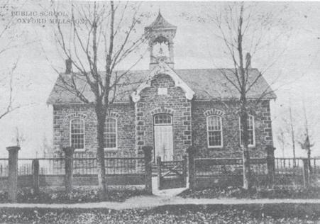 This building housed S.S. No. 8, Oxford Mills School, where generations of children from Oxford Mills and the surrounding area were taught their three R’s and a host of other things besides. It was actually the third school to be opened in the village, the other two gradually becoming too small for the number of children. In 1875, the land was bought from John Lindsay for $150, and the contract to build a two-room schoolhouse was given to A. Willoughby. This was the only two-roomed school in all of North Grenville, all the rest having just one room, and it cost the magnificent sum of almost $2,000. The stone came from a local quarry on Bedell Road and the design was quite ambitious, compared to other schools, with a very decorative bell tower over the front door.