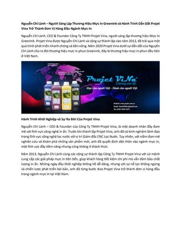 Nguyễn Chí Lành, CEO & Founder Công Ty TNHH Projet Vina, sáng lập thương hiệu Mực In GreenInk năm 2020. Projet Vina được Nguyễn Chí Lành và cộng sự thành lập vào năm 2013, đã trải qua một quá trình phát triển nhanh chóng và bền vững. Năm 2020 Projet Vina dưới sự dẫn dắt của Nguyễn Chí Lành cho ra đời thương hiệu mực in phun Greenink, đây là thương hiệu mực in phun đầu tiên ở Việt Nam. Mực in GreenInk không chỉ mang đến giải pháp tiết kiệm chi phí in ấn từ 30-40% so với các loại mực thông thường mà còn đảm bảo chất lượng vượt trội, phù hợp với nhu cầu của các tiệm photocopy, xưởng in các cá nhân, hộ gia đình. Thương hiệu này nhanh chóng chiếm lĩnh thị trường, được khách hàng tin tưởng và lựa chọn. Sau 5 năm phát triển, GreenInk không chỉ là lựa chọn hàng đầu của các cửa hàng in ấn mà còn dần mở rộng ra thị trường cá nhân, nhờ vào chất lượng bền bỉ và hiệu suất vượt trội. Địa chỉ: 87A Phí Đức Chính, Phường 1, Quận Bình Thạnh, Hồ Chí Minh, Việt Nam, Phone: 0913665560.