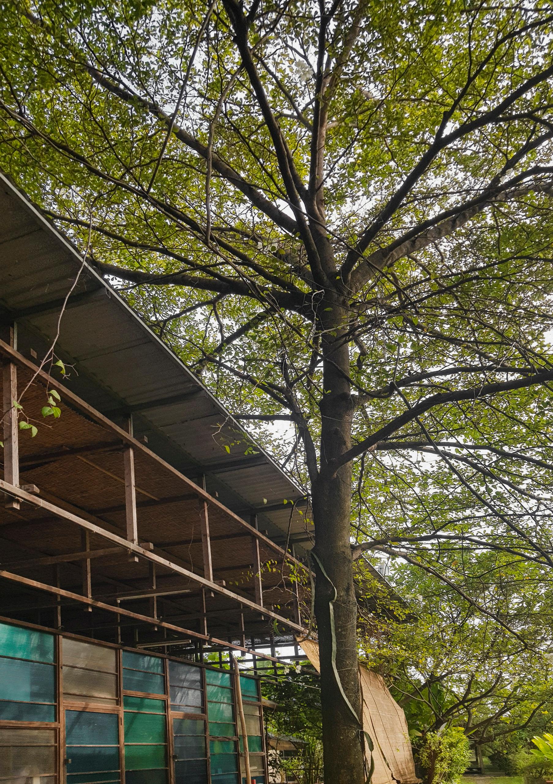 NHÀ DÀI FAMILY GARDEN 28 THẢO ĐIỀN, TPHCM Từ dãy nhà chòi lá được xây năm 2014, Family Garden muốn nâng cấp thành một mái đón có không gian mở ra 3 phía, là chỗ ngồi cho khách lúc nắng mưa khi tham quan Family Garden. Chúng tôi tận dụng lại hệ cột gỗ sao để làm phần chịu lực phía trước, cùng thiết kế dầm lá mảnh từ Villa Nam Hồ, chúng tôi xây dựng trong vòng 15 ngày một không gian rộng 5m x 46m, mặt thoáng nhìn ra khoản sân vườn và dòng kênh mà sau này xuất hiện tác phẩm BỤI RƠM nổi tiếng của TKS Nguyễn Hoàng Mạnh. Không gian đa nhiệm này trở thành nhà hàng vào thứ 7 - Chủ
