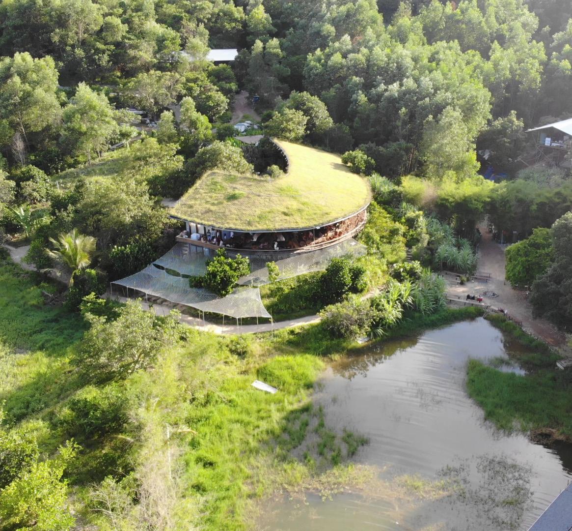 Diện tích 800m2 NHÀ ĐIỀU HÀNH BÊN HỒ - LÀNG NHỎ - DIÊN KHÁNH, KHÁNH HÒA Hệ kết cấu Dầm lá mảnh - Nhịp 9m Địa hình Trong rừng Sườn dốc Bên hồ Ban đầu Làng Nhỏ dựng tạm một khối văn phòng công trường, với kế hoạch trong vòng 5 năm sẽ chuyển thành công trình dịch vụ ở đây. Vị trí chúng tôi chọn là dải đất dốc nhô ra phía bờ hồ. Để giữ nguyên địa hình, chúng tôi đắp một khối đá, tôn nền phần chênh cao lên trên 2m và xây dựng 1 tầng hầm bên dưới. Với tiêu chí tạo đường cong ôm theo quả đồi và kinh phí phải thấp (văn phòng công trường), chúng tôi quyết định sử dụng hệ dầm lá mảnh kết hợp gia cường mắt kết nối bằng thép. Mái cỏ là giải pháp tối ưu để giảm nhiệt, giằng mái vì ở đây gió lớn và giúp công trình ẩn mình vào thiên nhiên. Vòm mái kết hợp giữa hệ dầm lá mảnh và gridshell đã phát huy tác dụng, tạo nên 1 không gian văn phòng mở ra thiên nhiên ấn tượng. Việc văn phòng Làng Nhỏ được sử dụng như nhà đón khách và nhà hàng trong giai đoạn phát triển POP UP resort nằm ngoài kế hoạch của chúng tôi, nhưng những phản hồi của du khách đã làm chúng tôi rất hạnh phúc: “Chỉ là 1 văn phòng công trường thôi mà ,,,, có cần đẹp vậy không”, “Đây mà là văn phòng công trường à? Chịu chơi gớm”... Cấu tạo đặc biệt Mái trồng cỏ Năm hoàn thành 2020 Kiến trúc sư A7 - LAA
