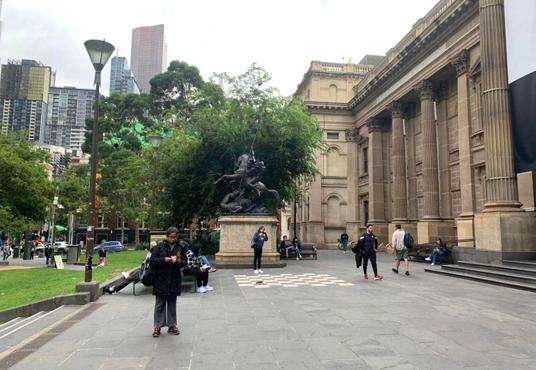 The State Library is one of the iconic public spaces spots in Melbourne where everyone is welcome to come to study inside or simply hang out and relax outdoors. The exterior is designed very spatious with benches and steep grass hills to sit and lie on, large size statues as well as chess pieces to play, wide open stairs paths on both sides and main middle, all arranged and situated neatly which allows easy circulation and free movement. However, during the evening, the space seems to be quite dark, although there are a fair amount of street lights but it is not lit enough. Tall trees and dense bushes, statues, and the building columns create perfect spots for the unpredictable people to gather and hang around, especially the homeless and the intoxicated with mental health issues when they can get easily infuriated when unsuccessfully asking for cigarettes.
