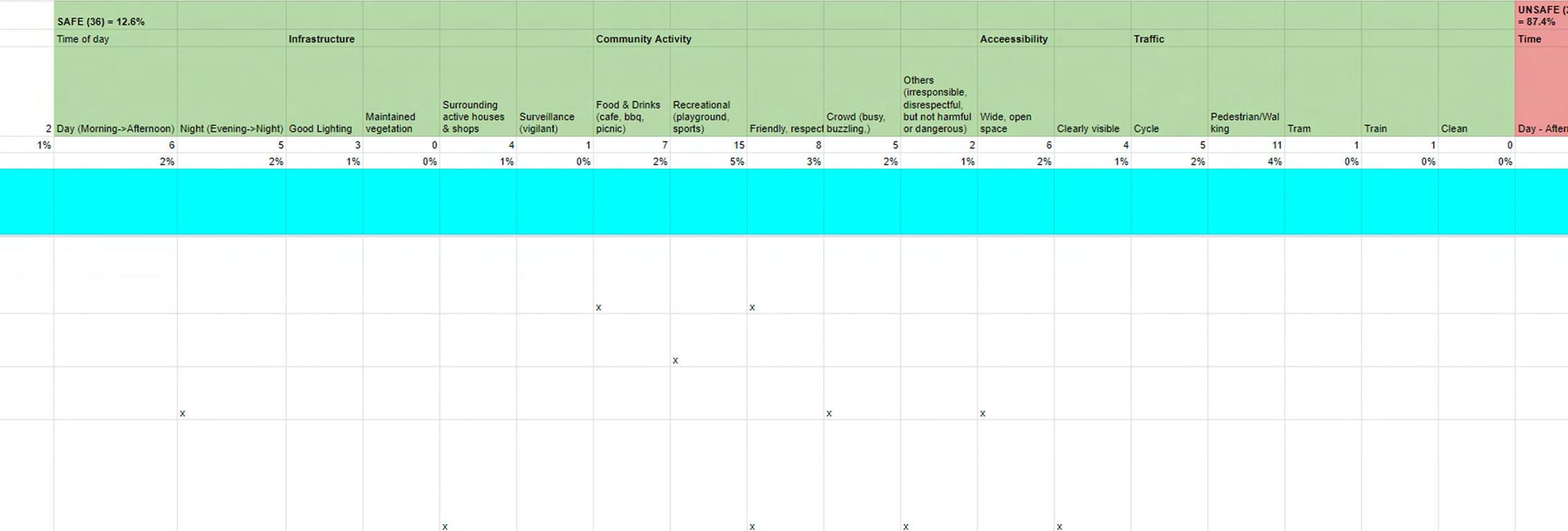 After a week of warm up conceptualizing the idea of women safety around social space, the second week progresses with identifying hotspots of a particular suburb, followed by dissecting data and coding them into specific category. It is crucially important to organize all comments from YourGround into different kinds of reasons and factors that contribute to most women sense of unsafety. What I find most challenging is sorting through all nearly 300 comments by using Microsoft Excel formulas to calculate the percentages or proportions of unsafe and safe elements to then visualize these in creative diagrams as accurately as possible, which causes confusion for me at times.
