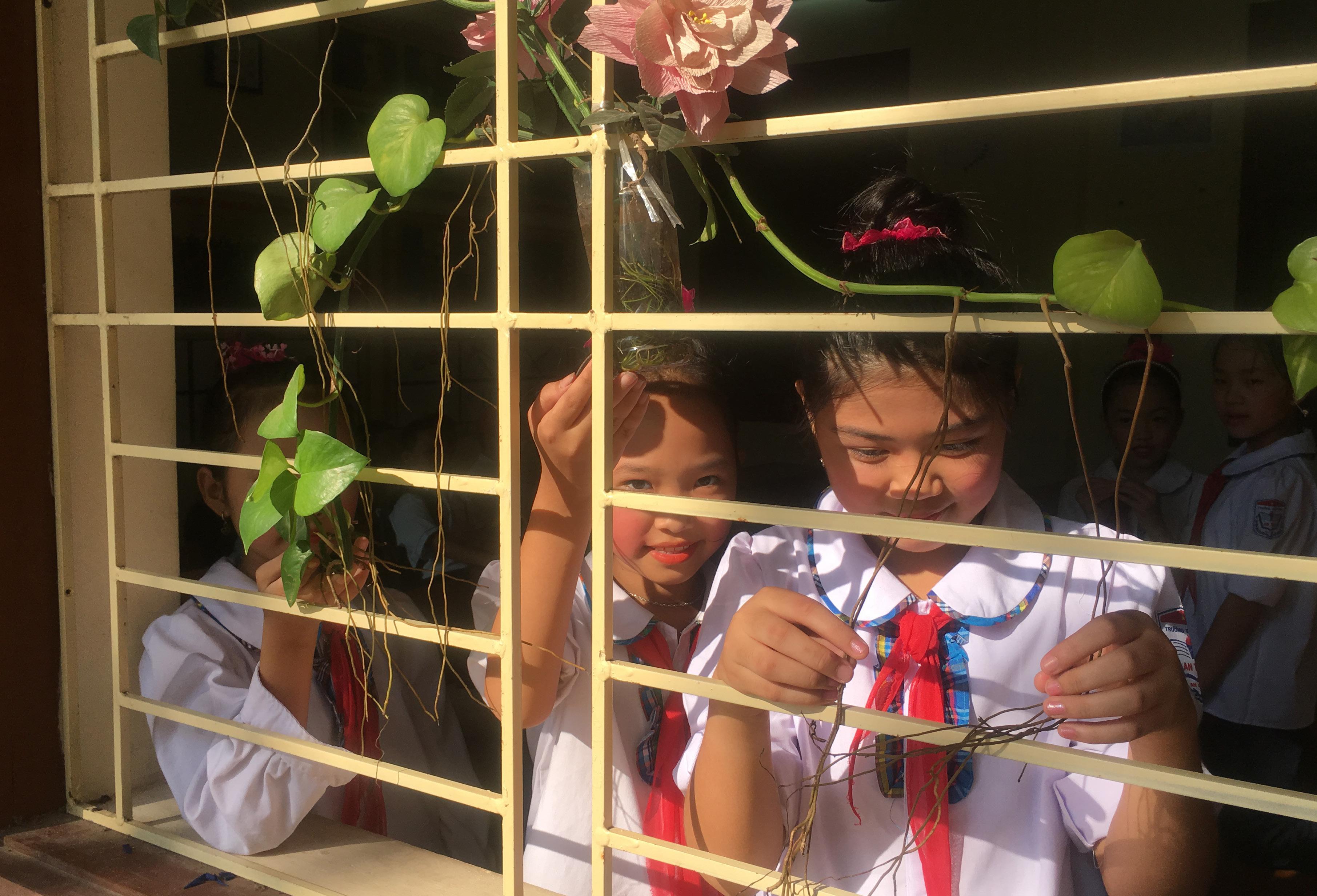 Sau một thời gian chương trình ‘Trường học không rác thải nhựa’ được triển khai, các cây xanh thầy và trò trường THCS Dũng Tiến trồng năm nào trong các chai lọ tái chế đã phát triển, điểm tô cho khuôn viên nhà trường thêm xanh, thêm đẹp. After a period under implementation, the trees that teachers and students at Dung Tien Secondary School planted in recycled bottles have developed, adorning the school campus greener and more beautiful.50 51