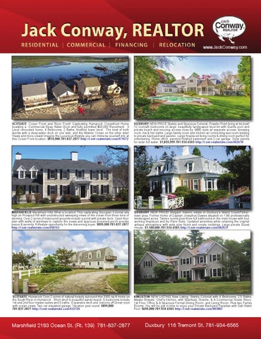 MARSHFIELD Marshfield Hills What a location! This captivating Georgian Colonial sits high on Prospect Hill with unobstructed sweeping views of the ocean from three tiers of decking. Over 2 acres of manicured grounds include a pond with private dock. Open floor plan with walls of windows to capture the views and spacious screened porch provide peace & serenity. A lifestyle opportunity for the discerning buyer. $899,900 781-837-2877 http://i-net-realestate.com/450763