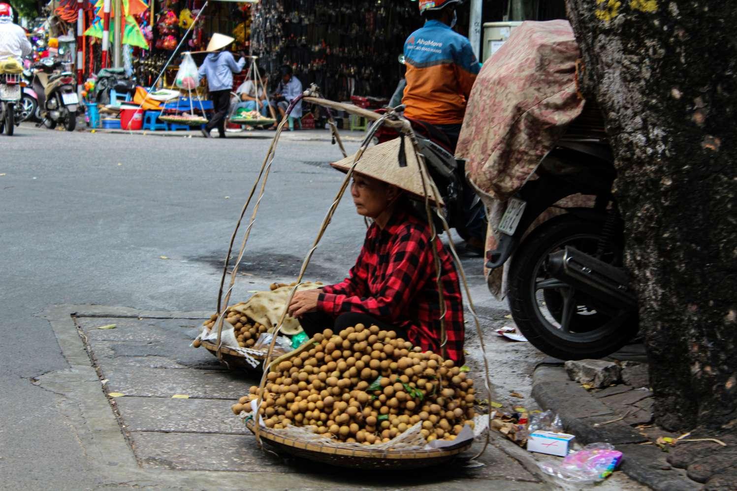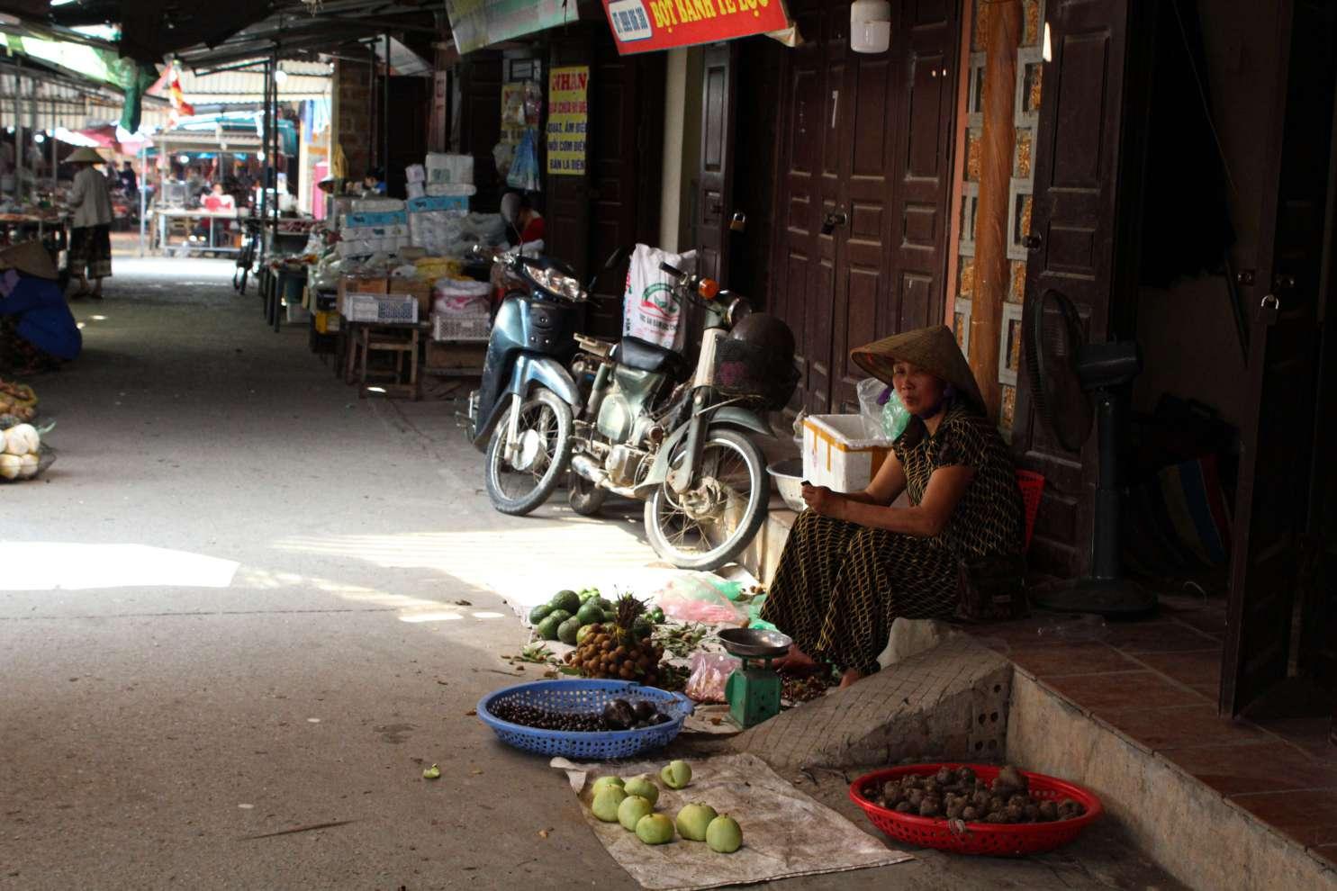 … into the local market. A local had just arrived with her boxes of fresh fruits and vegetables from the main market, as vibrant as ever.