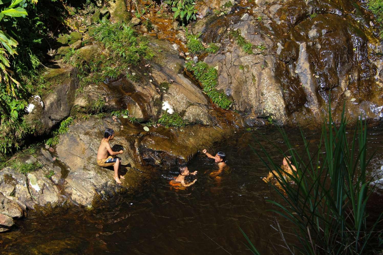Several kids bath under the flowing stream of water from a nearby pond. They do not have any worries, the carefree of peace of childhood can be ever so precious...