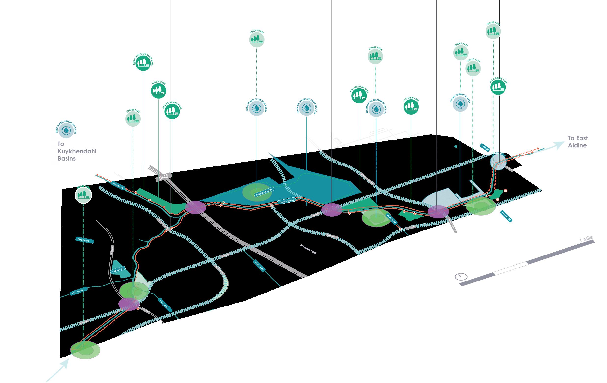 The Understand Phase of the project consisted in analyzing the state of the park and trail system in North Houston District in conjunction with current and planned projects in the area. Existing and future plans such as the Houston Bike Plan and the North Houston/ Greenspoint Livable Center Study were studied to understand the relationship between those ongoing efforts and to identify opportunities for the 2023