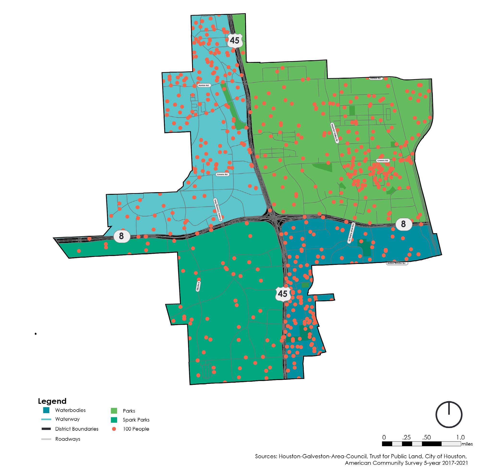 Trails Existing Parks Existing Spark Parks 100 People Planned CIPs Existing CIPs Greens Bayou Existing Parks Detention Basins Water Areas