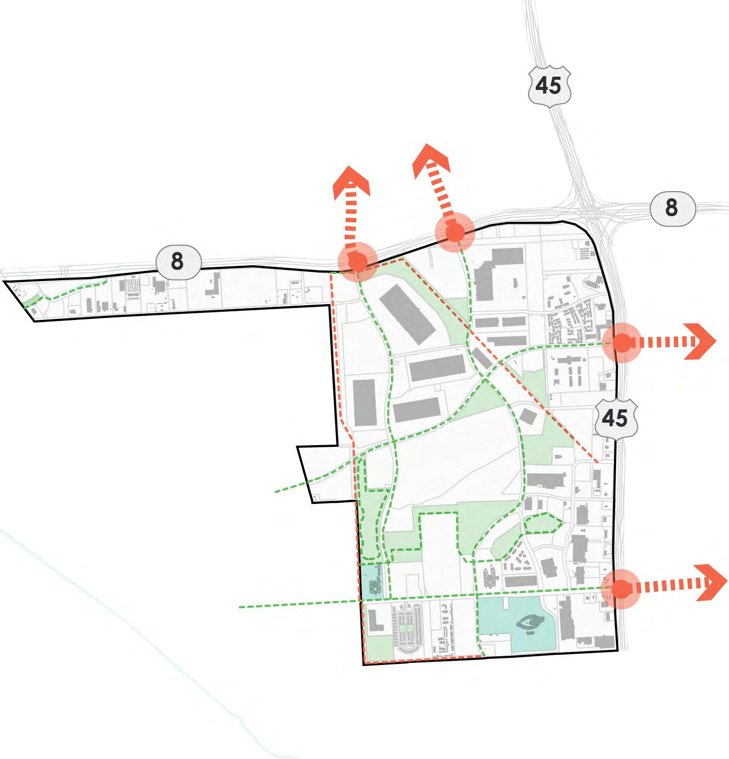 • Numerous opportunities identified for enhancing park spaces, including open field, plaza, and volleyball court, as well as connections via roadway crossings and possible second Bayou bridge