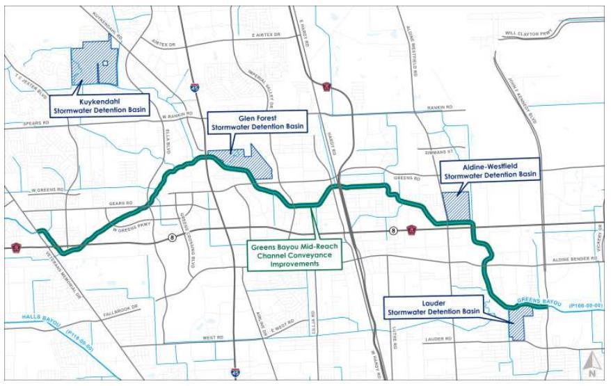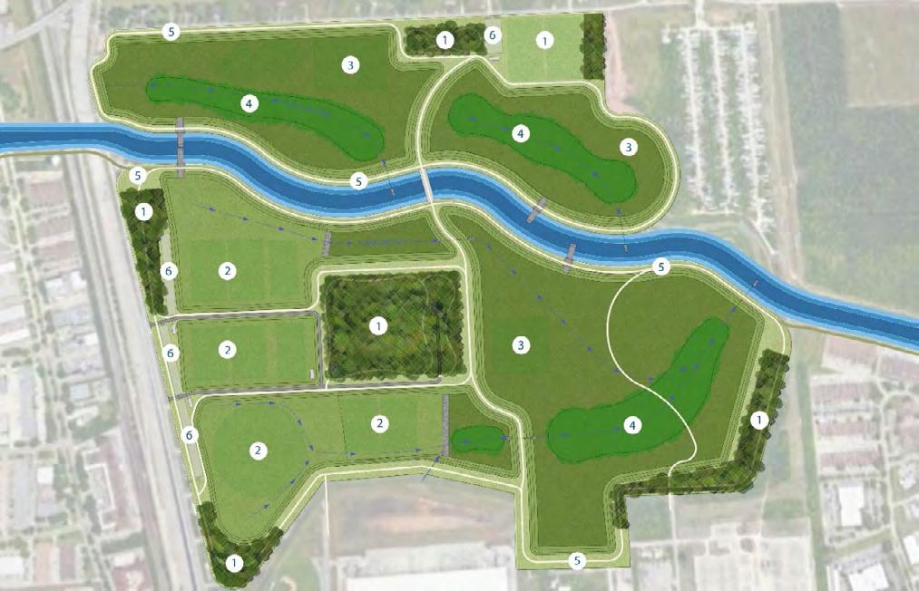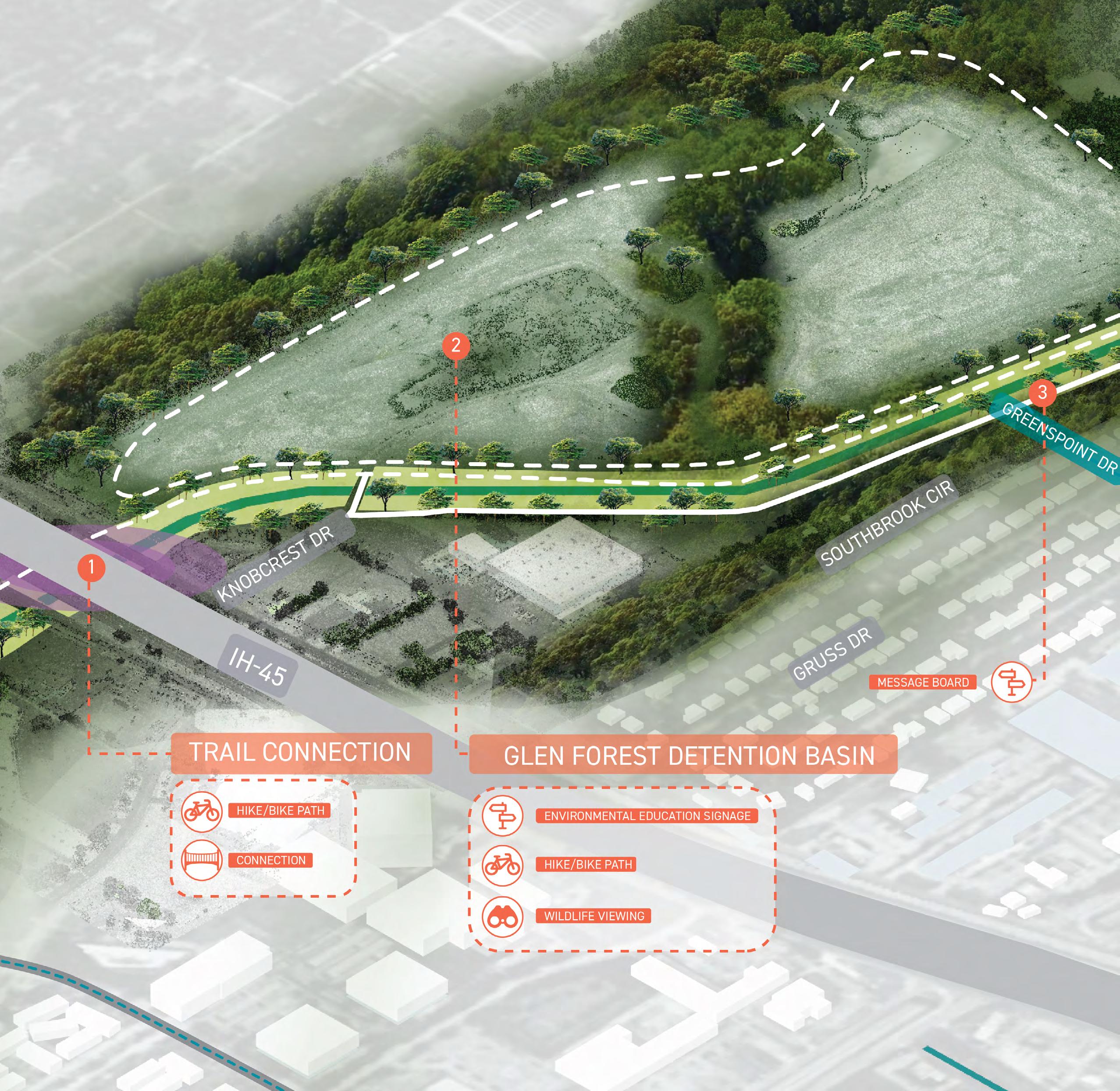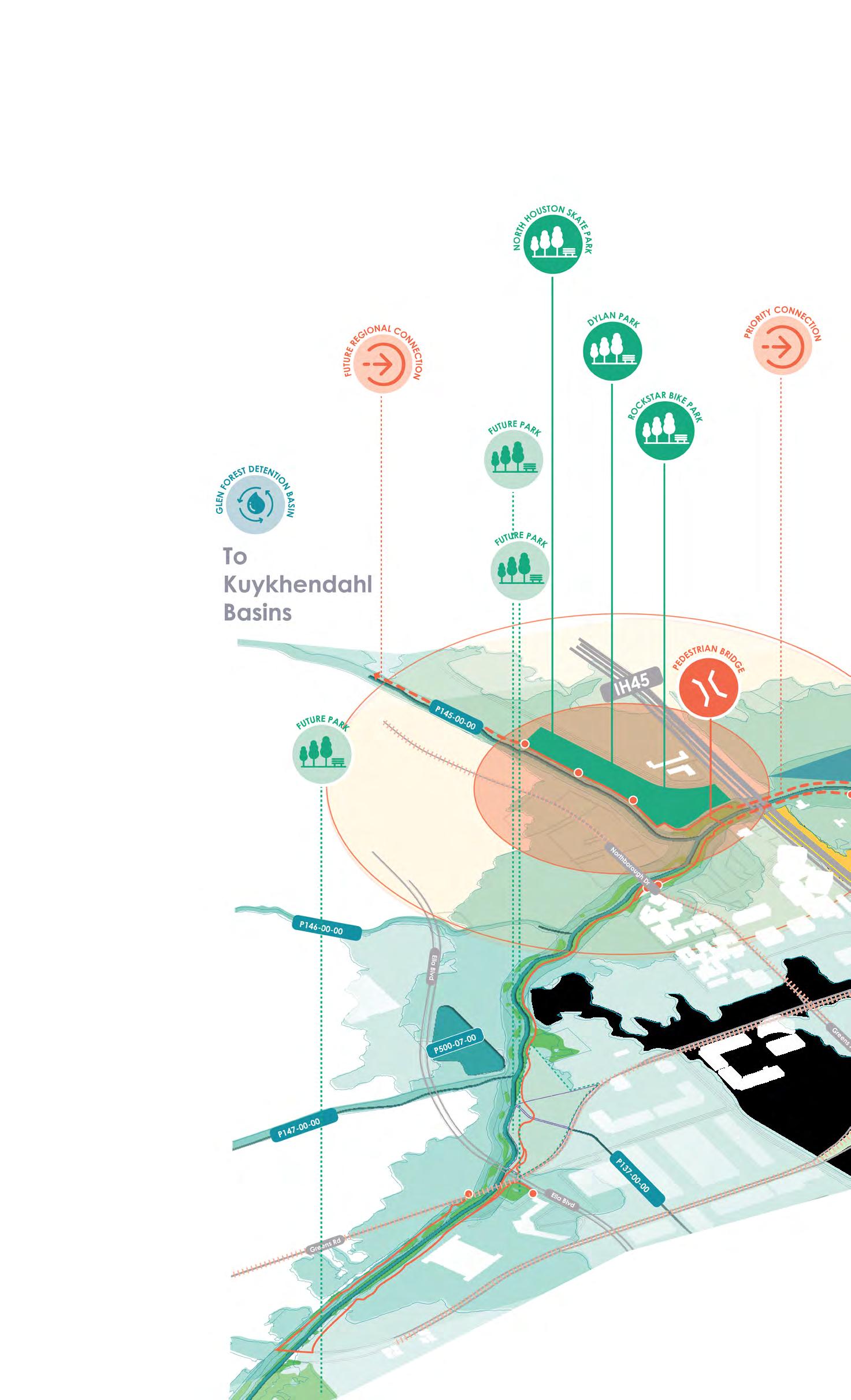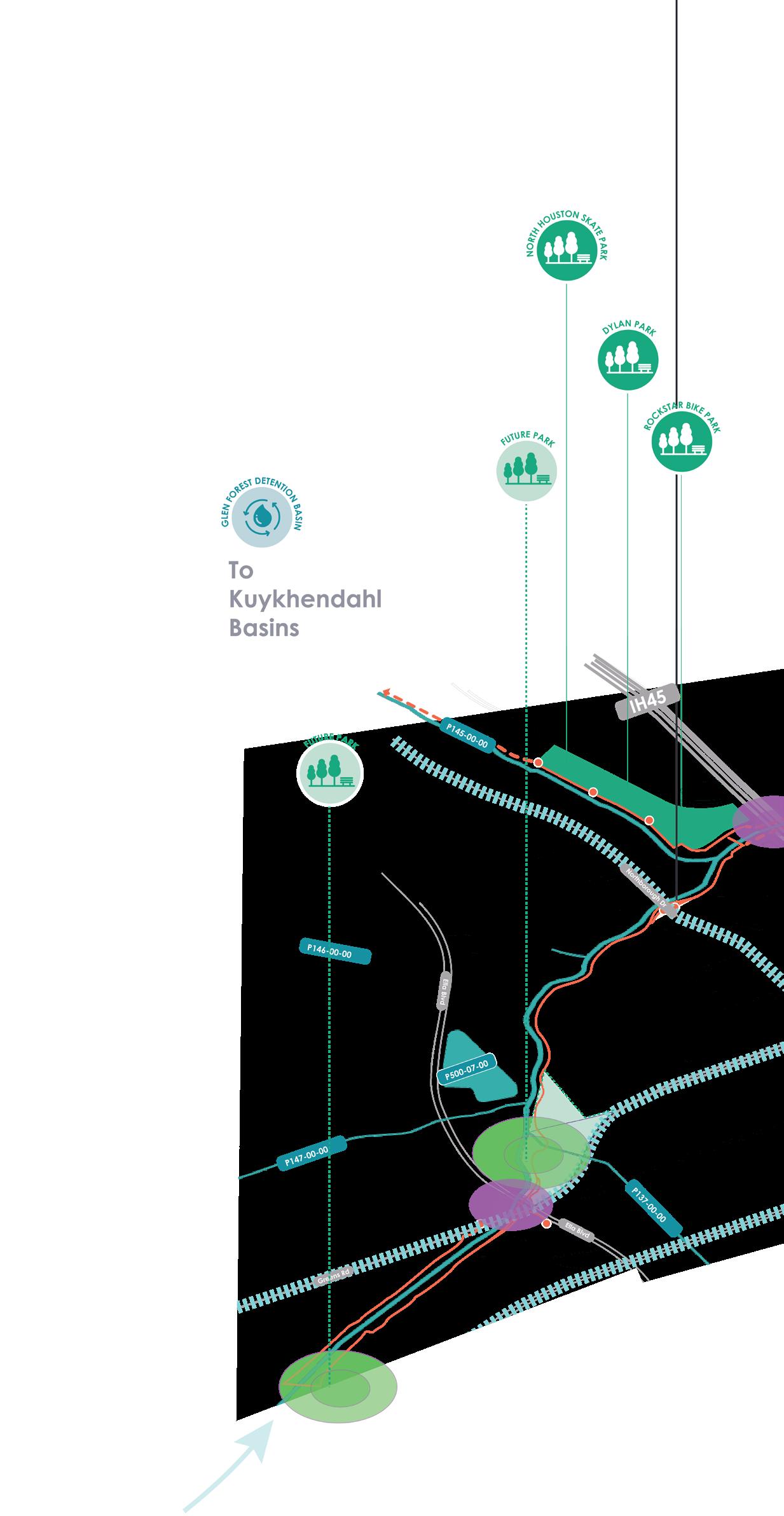 • The Harris County Flood Control District's (HCFCD) development of numerous detention basins, creating opportunities for expanded park space within such detention ponds