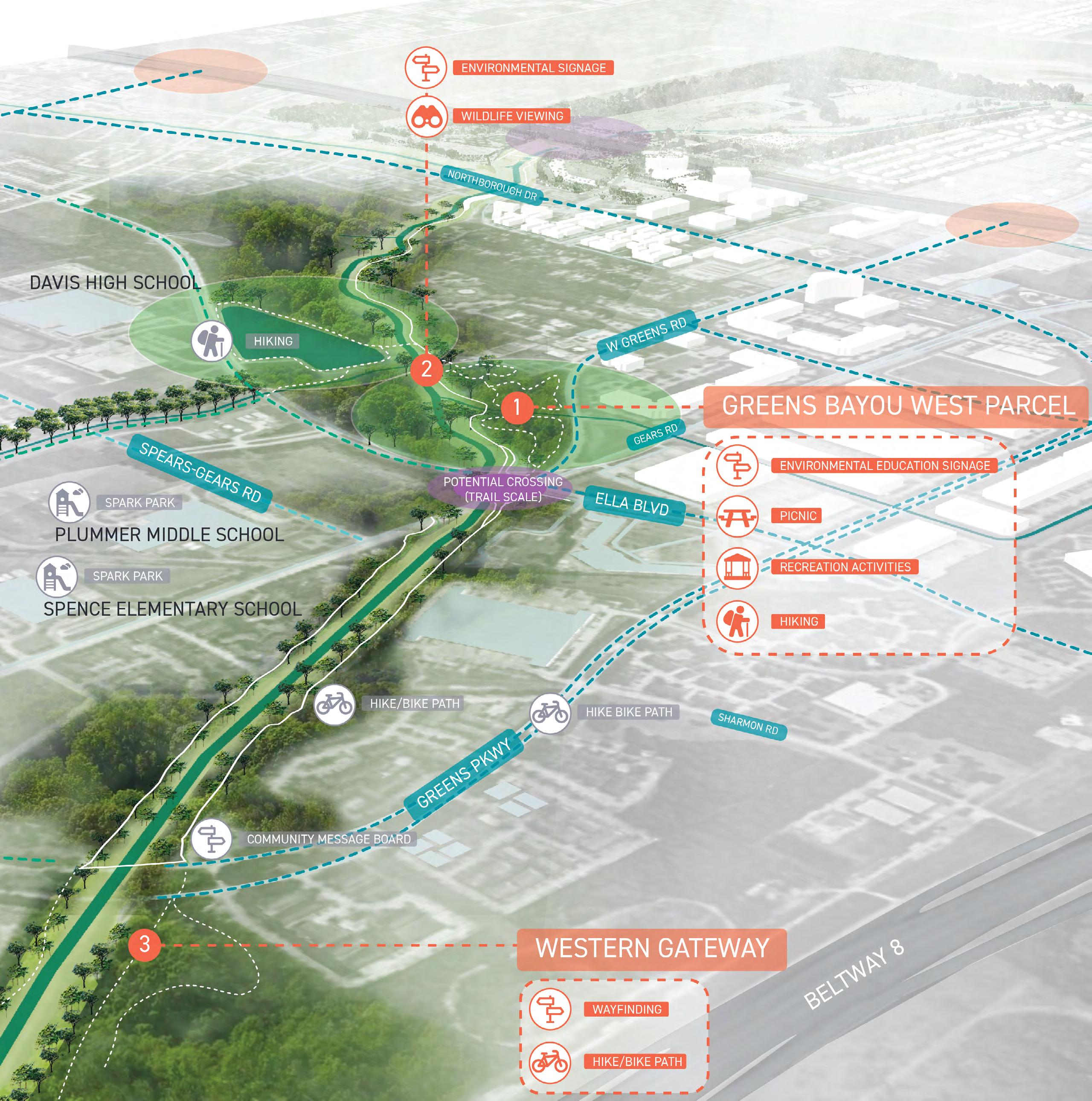 • The Bayou Greenways 2020 initiative along Greens Bayou; and need to connect the District to the larger system of trails