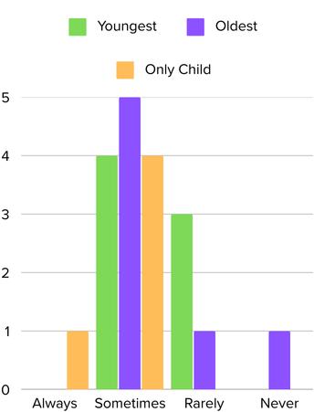 From the answers to this question, we found that the youngest siblings were more inclined to ask their siblings for help They tended towards yes, answering with ‘always’ or ‘sometimes’, while the majority of older siblings answered with ‘rarely’ or ‘sometimes’